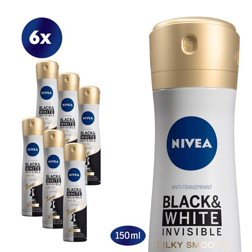 NIVEA Invisible For Black & White Silky Smooth Anti-Transpirant is de eerste anti-transpirant die zowel witte strepen op donkere kleding als ook gele vlekken in lichte kleding voorkomt. De formule is ontwikkeld voor een zijdezachte huid en irriteert de huid niet na het scheren. 48 uur lang betrouwbare bescherming tegen transpiratie en lichaamsgeur en biedt de milde verzorging van NIVEA.